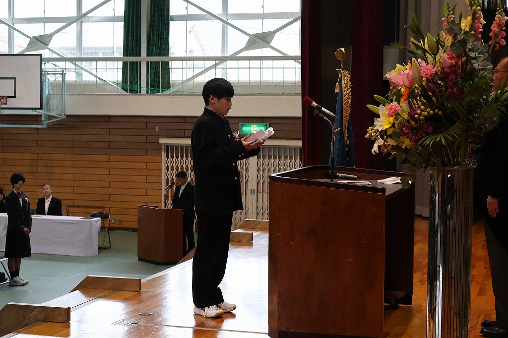 電気情報科の長安くんは、大きな声で爽やかに「ハイ」と返事をして舞台に上がり、次のような決意を述べました。