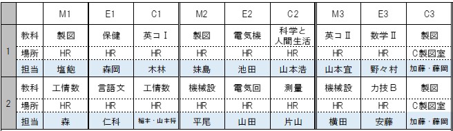 なお、5月9日(土)の特別時間割は次のとおりです。